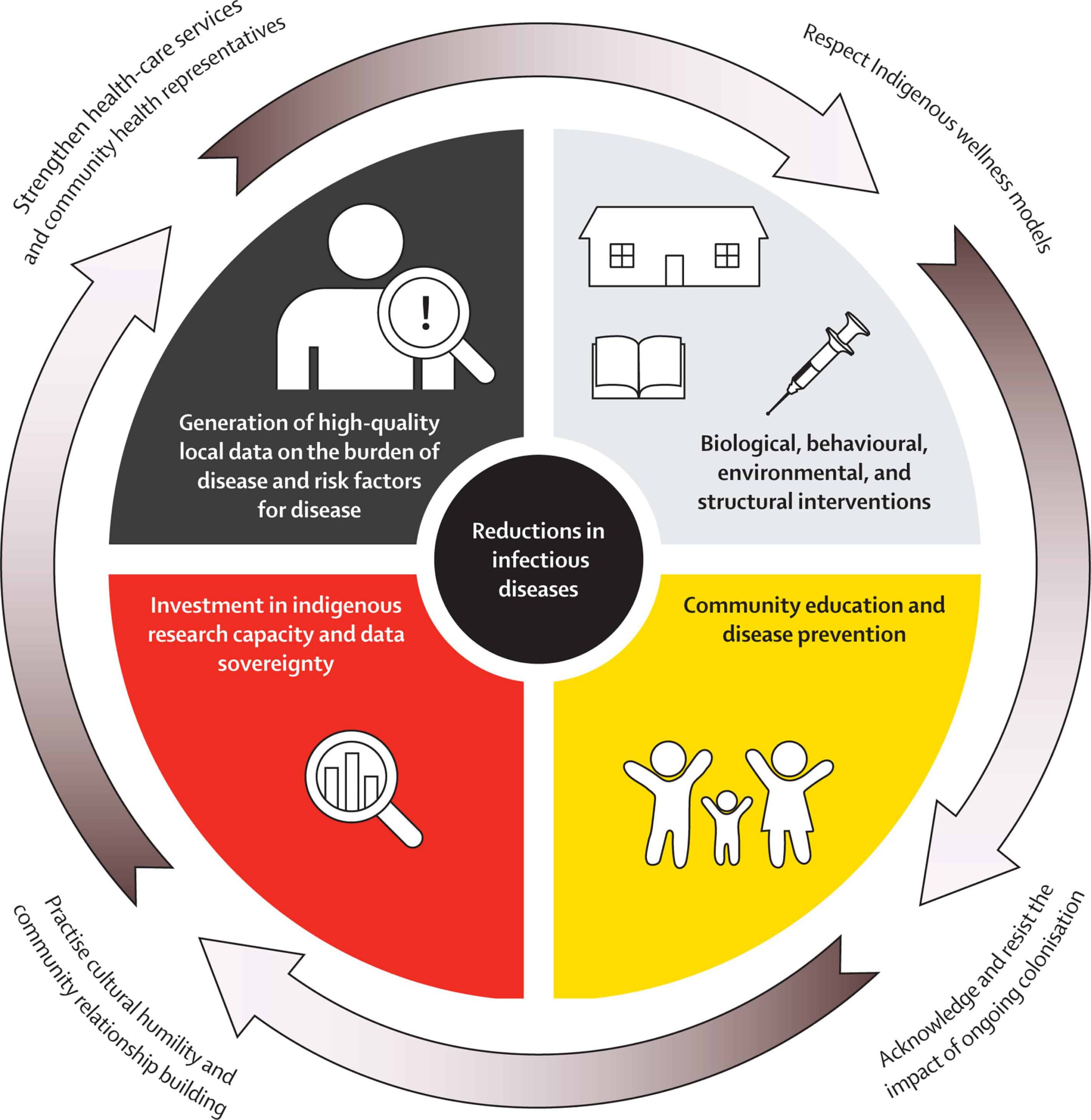 “We propose a framework for achieving sustainable improvements in the overall health of Indigenous people, including reductions in infectious diseases (figure 2). We must start by acknowledging the enduring effects of colonisation and assimilation tactics, and the existence of structural racism in modern society. To overcome these effects, government and health-care providers should focus on cultural humility (respect for tribal sovereignty, active self-reflection, and the addressing of power imbalances, etc) and community power building. Additionally, health care should recognise the holistic approaches to health reflected in Indigenous wellness models. Although safe and efficacious vaccines have greatly reduced the burden of infectious diseases, fundamental changes to laws and policies are needed for upstream disease prevention and control.”