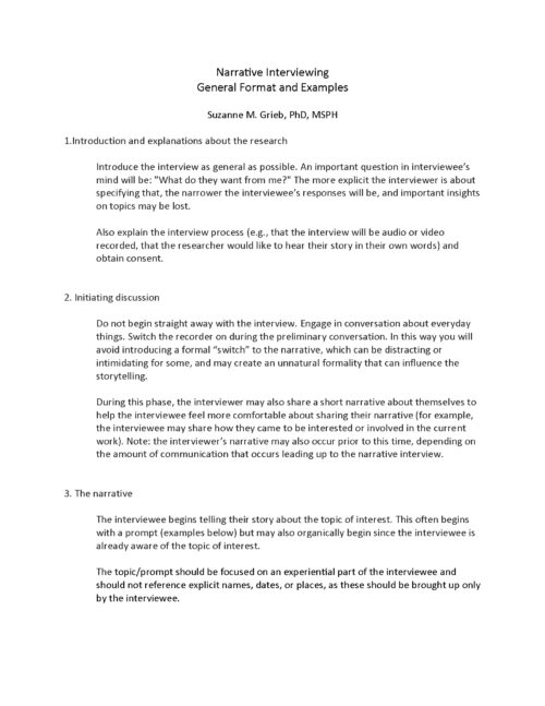 Developed by Suzanne M. Grieb, PhD, MSPH. Overview of narrative interviewing, including its general format and guidance on how to conduct such interviews.
