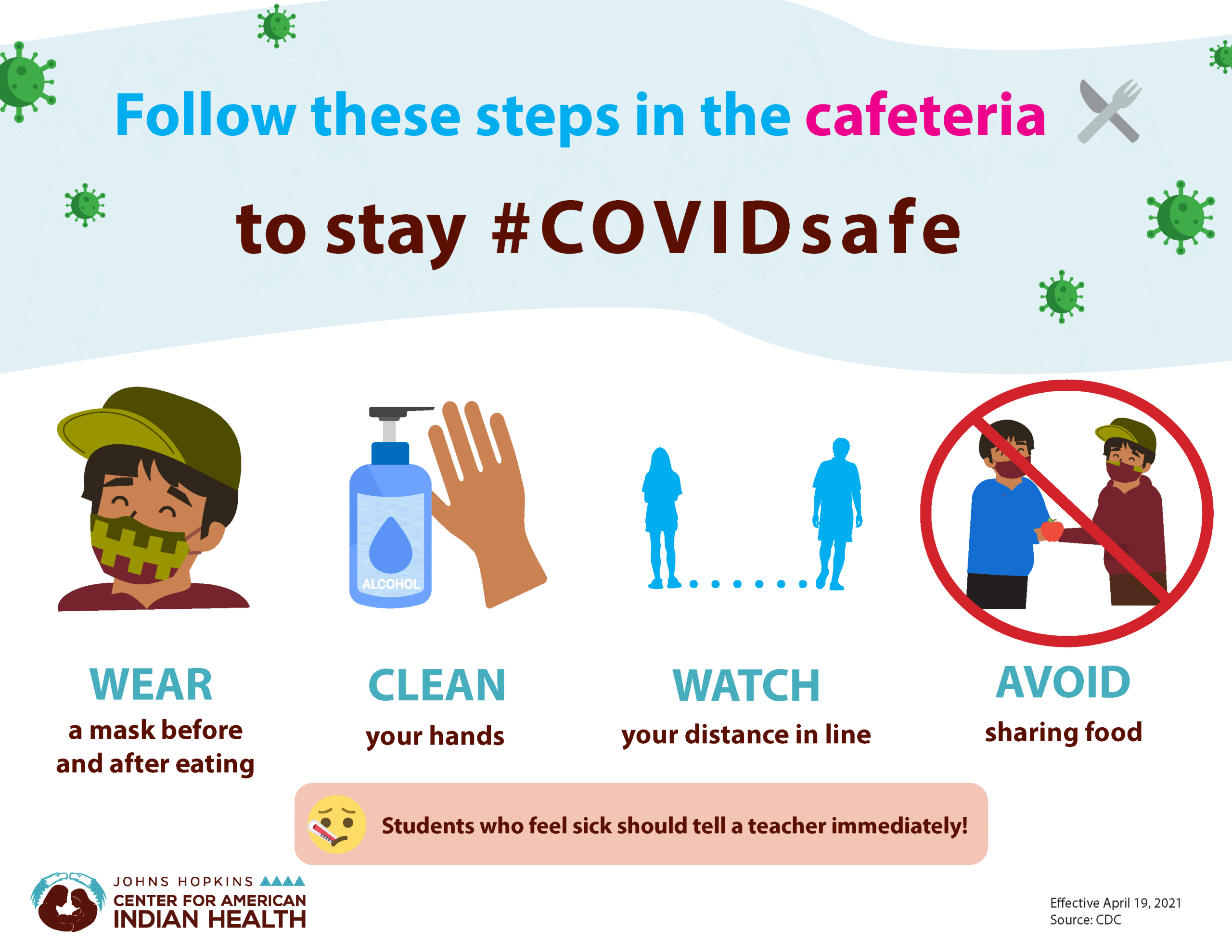 Safety tips for children at school while in the cafeteria during the COVID-19 pandemic.