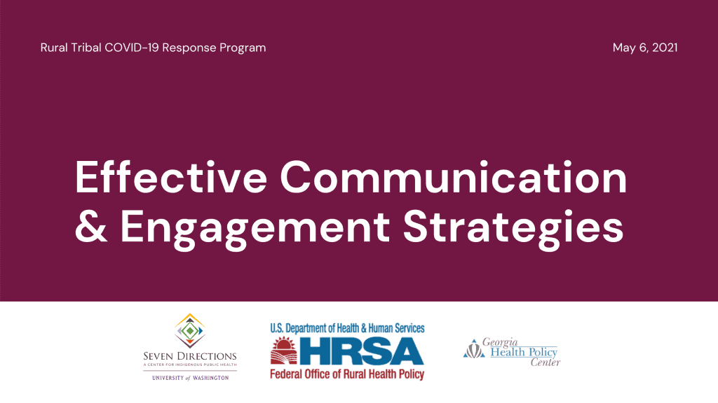 This panel is provided by Seven Directions, an Indigenous Public Health Institute, and Georgia Health Policy Center as part of the Rural Tribal COVID-19 Response Program. This panel presentation covers health communications strategies and effective presentation of COVID-19 data in Native communities. Panel speakers include Ashlee Jallen at the Native American Community Clinic, RandyL Teton at Shoshone-Bannock Tribes, Jennifer Wolf at Project Mosaic LLC, and Sydney White at the Johns Hopkins Center for American Indian Health.