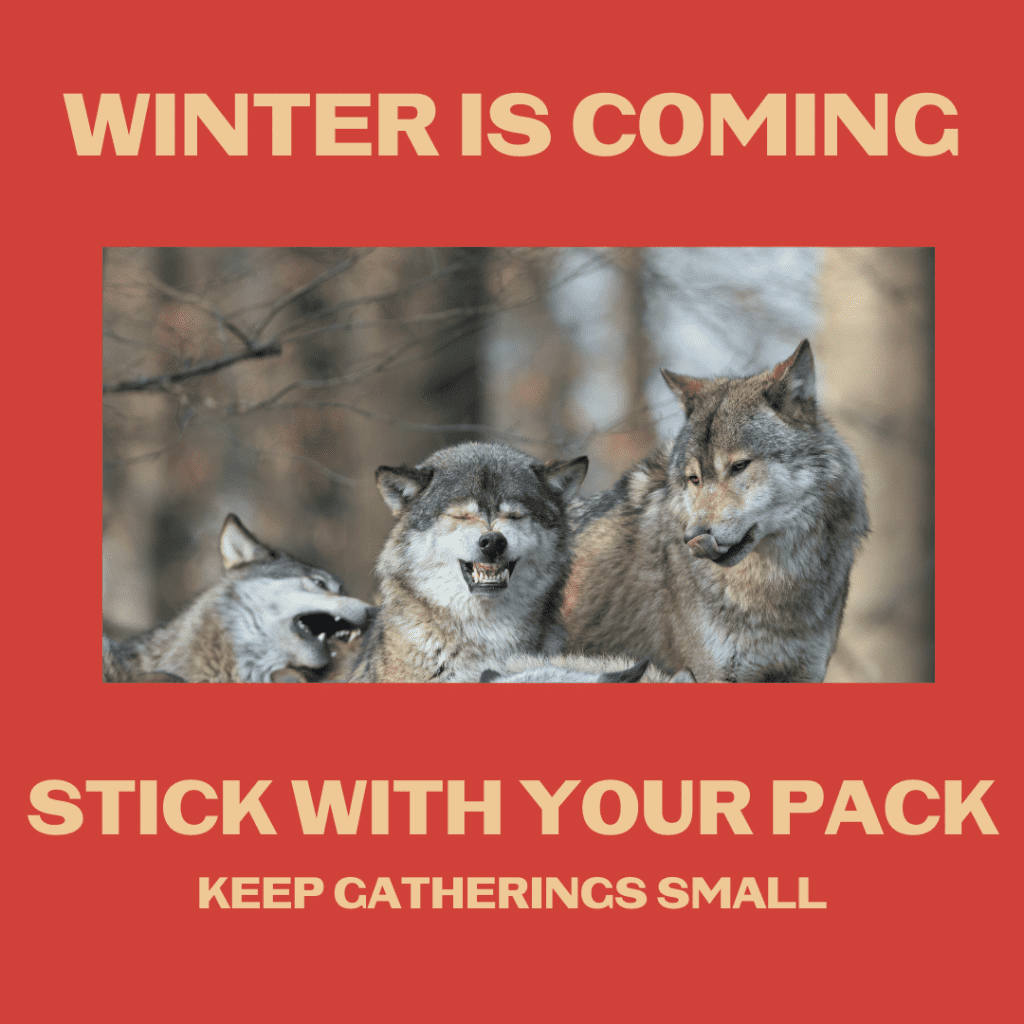 Humorous meme and message encouraging small gatherings to prevent the spread of COVID-19.